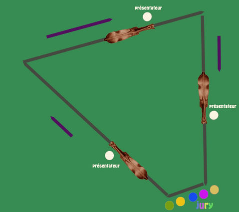 Etat général Les chevaux doivent être présentés en bonne santé, plein d’énergie et donc avoir été nourris en conséquence (ration augmentée si besoin + huile) et vermifugés au minimum un mois avant l'échéance. Prévoir le passage du maréchal-ferrant une semaine avant, et parer le foal si nécessaire. Les chevaux qui ne sont pas en état partent avec un handicap. Le poil doit être soyeux et la robe brillante, l’idéal étant le « poil de souris » tant recherché. La crinière et la queue doivent être soignées, régulières et bien démêlées. Le présentateur est traditionnellement en tenue blanche, tenue sombre ou noire tolérée. Il doit être vêtu correctement (jeans et tee-shirt déconseillés) et proprement. Sur la carrière de présentation Venez placer votre cheval de profil, à 5 mètres environ devant les juges, côté hors crins. Faites face au cheval afin de pouvoir avancer d’un ou deux pas votre cheval afin qu’il repose sur ses quatre membres. Le latéral côté juges légèrement plus ouvert de manière à ce que les deux pieds du côté de l’observateur ne masquent pas les deux autres. Le postérieur du coté des juges sera légèrement en arrière. Vous pouvez apprendre à votre cheval l’ordre « un pas », afin de pouvoir le faire avancer juste comme il faut. Immobilité Les juges feront le tour d’inspection autour du cheval. Restez immobiles, les juges vous indiqueront le moment de faire votre premier tour au pas. Allures : la présentation du cheval doit être précise et brillante pour le valoriser au mieux. Le tour au Pas : Prenez les rênes ou la longe comme pour amener le cheval sur le terrain et partez au pas, à hauteur de son épaule gauche, en tournant le dos au juges. Marchez droit en formant un triangle à main droite. Le Pas doit être calme et énergique, la foulée longue avec de l’engagement. Lorsque l'empreinte du postérieur dépasse vers l'avant l'empreinte de l'antérieur correspondant, le cheval se "méjuge". C'est la marque du cheval souple, énergique et engagé. Le tour au Trot : Il suit tout de suite le tour au pas et c'est probablement l’instant du jugement le plus important afin d’être classé au plus haut niveau. Une grande liberté doit être donnée à l’encolure. Le cheval doit trotter naturellement, énergique, allongé mais le cheval doit rester contrôlable. Là aussi entraînez vous à la maison de manière à ce que votre Shagya sache ce que vous attendez de lui. Après un tour au trot (éventuellement deux à la demande des juges), vous placerez à nouveau le cheval devant le jury et vous attendrez qu'on vous indique que vous pouvez quitter la carrière. En cas de doute sur la maîtrise d’un jeune cheval, il vaut le mieux mettre en filet (chevaux de plus de 2 ans) que de ne plus avoir d’action sur celui-ci et se faire emmener. Les chevaux doivent rester calmes et aux ordres. C’est vous qui présentez et non pas votre cheval qui vous promène !!! Soyez bien organisé et calme pendant les présentations, vous ferez déjà bonne impression si vous entrez dans le ring détendu et avec un cheval aux ordres.